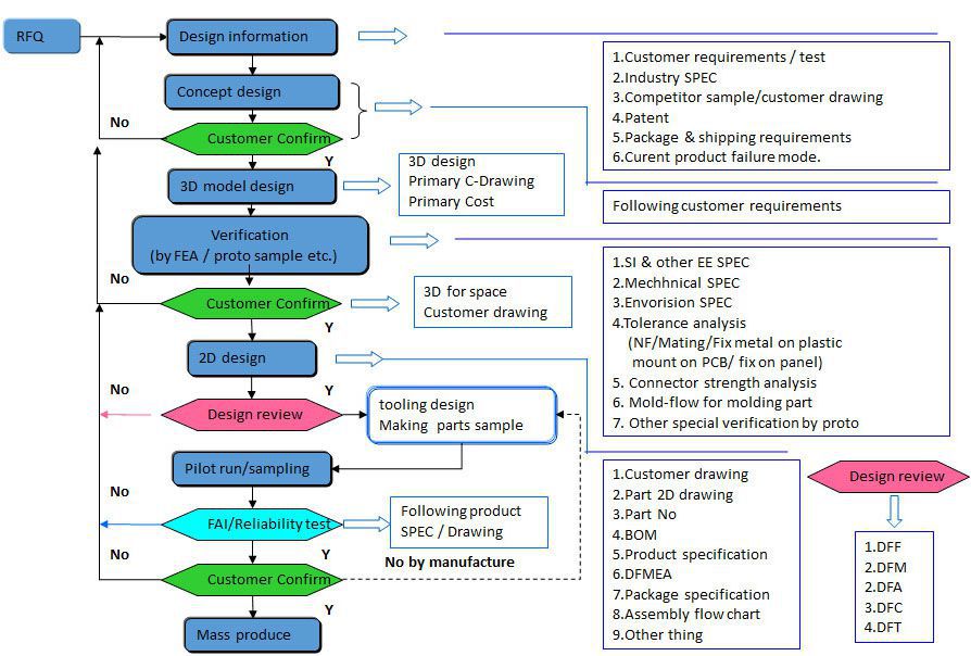 為保證產品開發的時效,品質,公司建立了完善的產品開發流程,使產品從設計導入開始,到產品設計驗證完成量產的整個過程都處于掌控之中,從而為滿足客戶產品性能要求,降低產品制造成本,保證產品制造質量,縮短產品開發周期,奠定了必要的流程基礎。